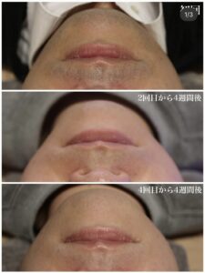 初回と4週間後、4回目から4週間後の顎の写真です。数回でも毛の伸びが遅くなりました。
