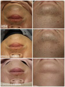 初回と2週間後、12回目から4週間後の顎と顎裏の写真です。触り心地の良い肌になりました。