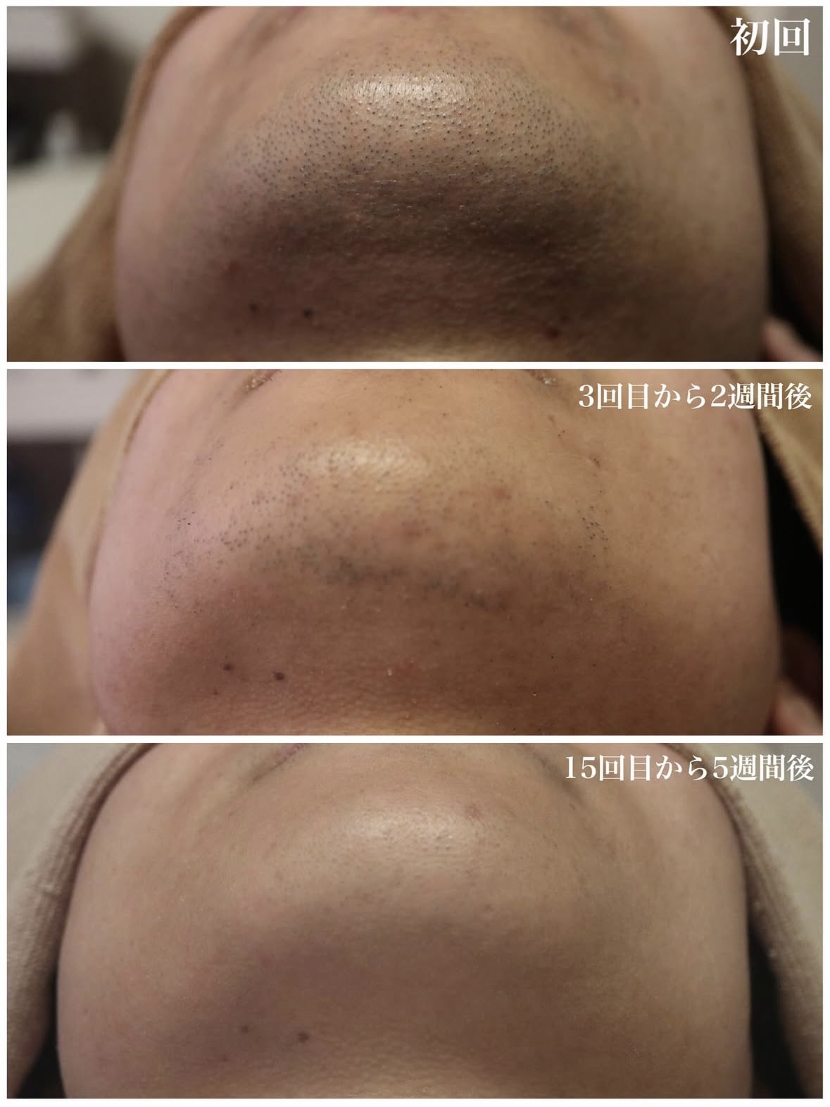 初回と3回目から2週間後、15回目から5週間後の顎裏の写真です。途中でまばらに抜けて綺麗になっていきました。
