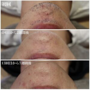 初回と4回目から2週間後、13回目から7週間後の顎の写真です。チクチク感がなくなりました。