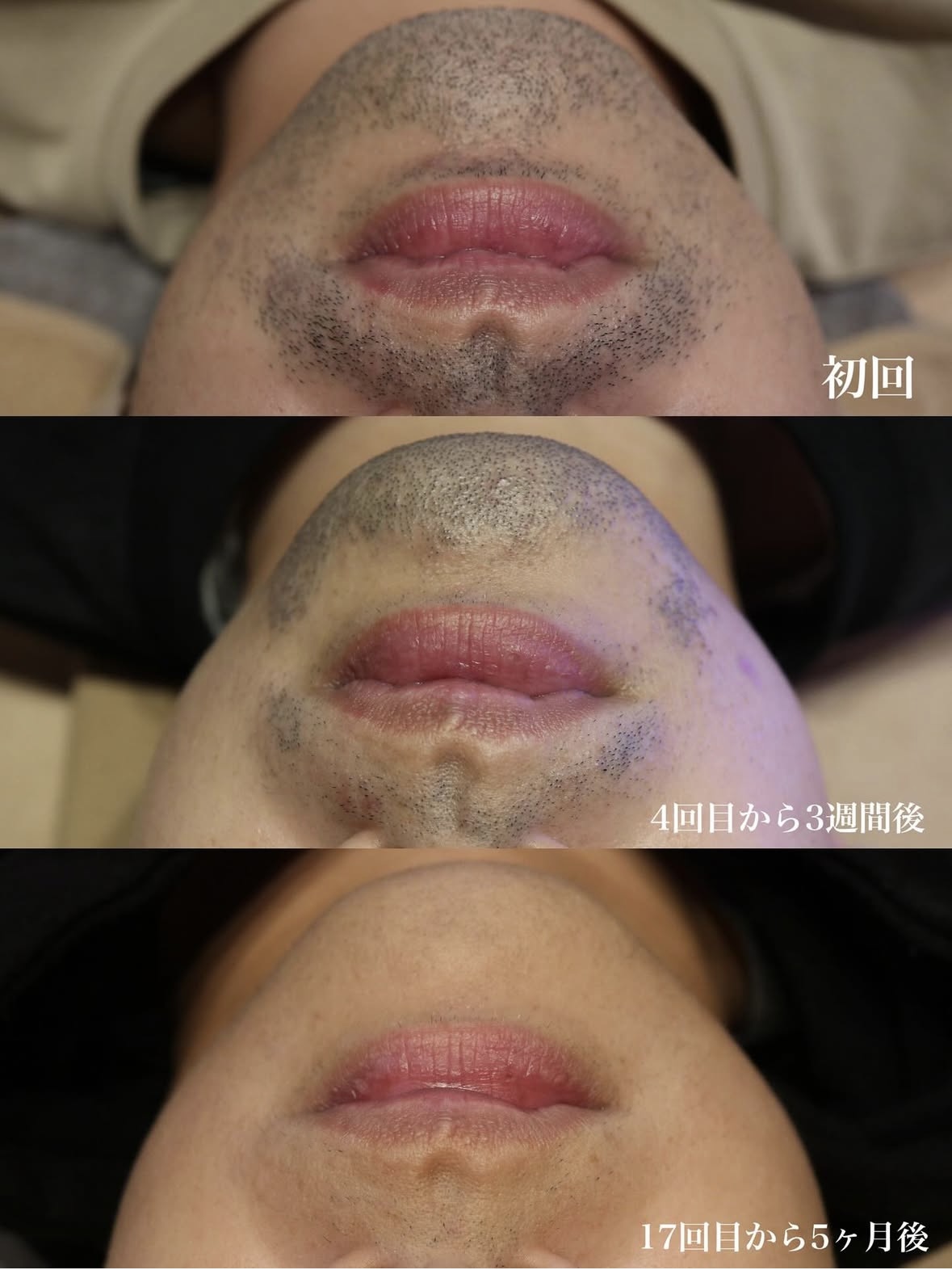初回と4回目から3週間後、17回目から5か月後の顎や口周りの写真です。抜けにくい箇所はレベル調整しゆっくりあてていきます!