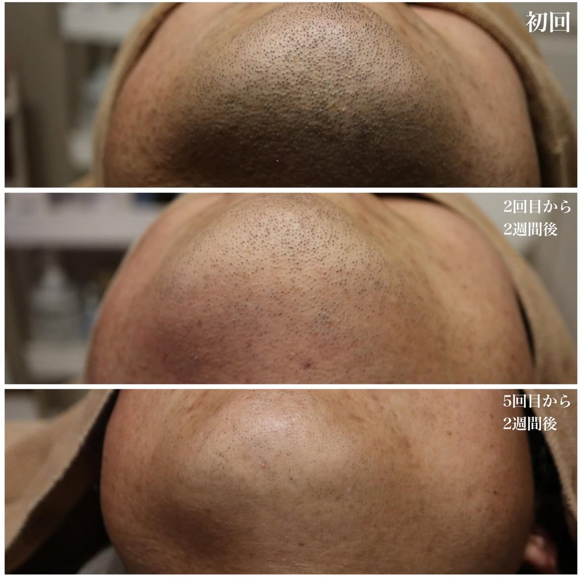 初回、2回目から2週間後、5回目から2週間後の写真です。みっしり生えていた髭もスッキリ♪