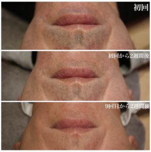 初回、初回から2週間後、9回目から2週間後の写真です。髭で青っぽく見えていた肌が明るくなりました♪