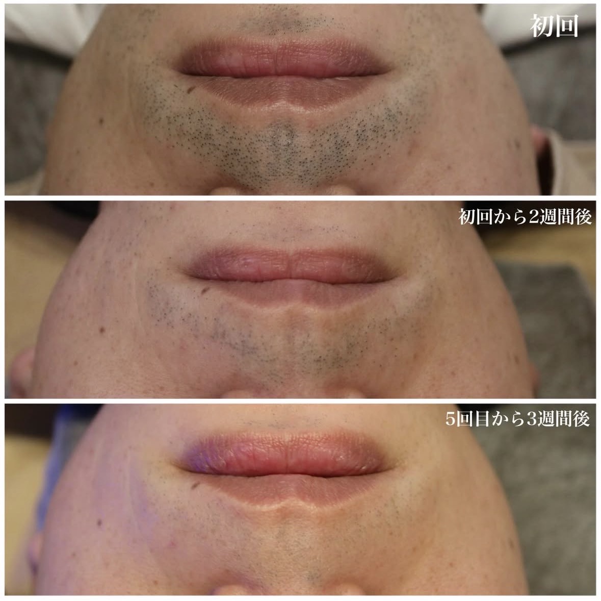 初回、初回から2週間後、5回目から3週間後の写真です。数回の脱毛でこの抜け具合♪