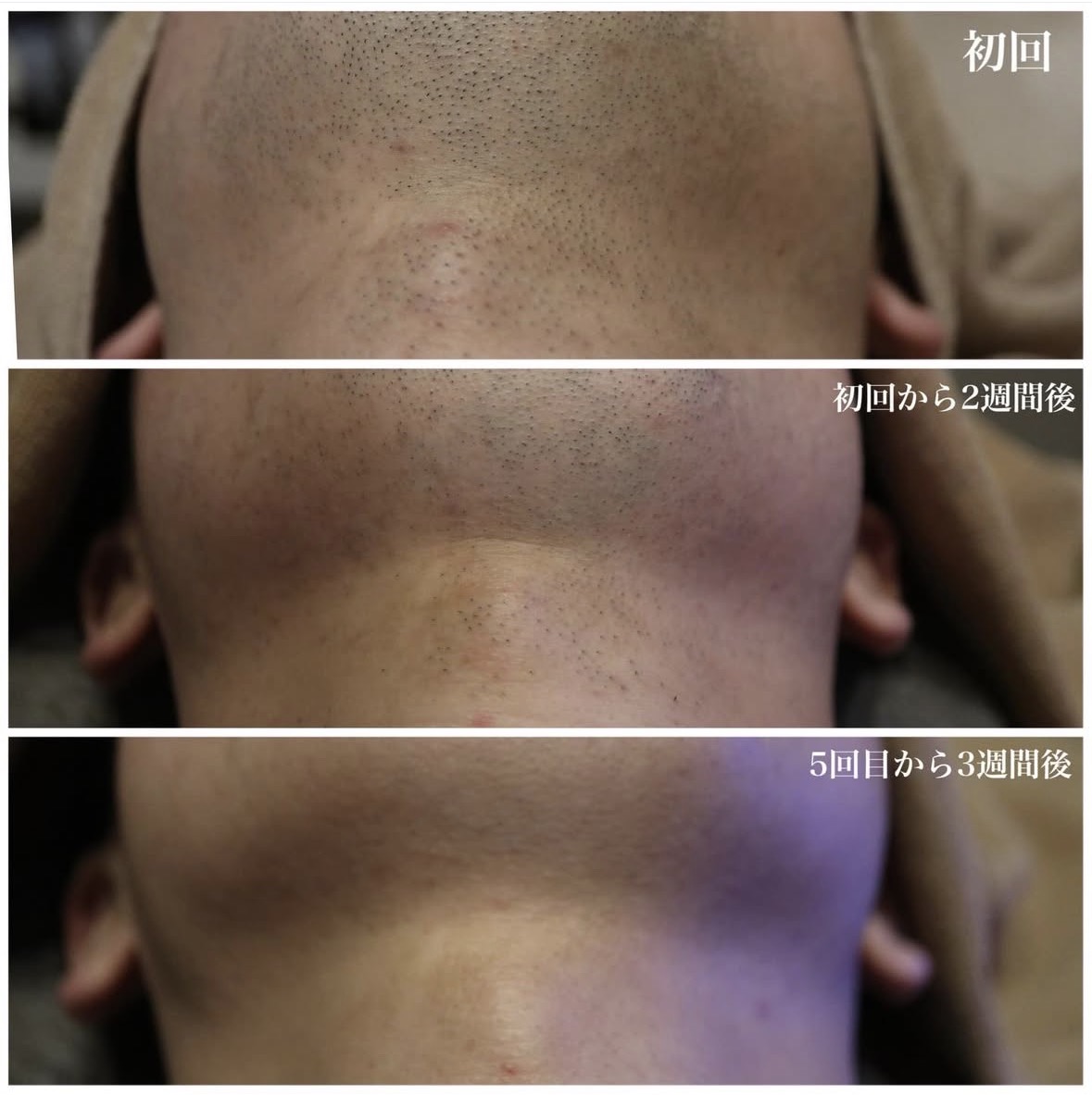 初回、初回から2週間後、5回目から3週間後の写真です。髭も肌荒れもまとめて綺麗に♪